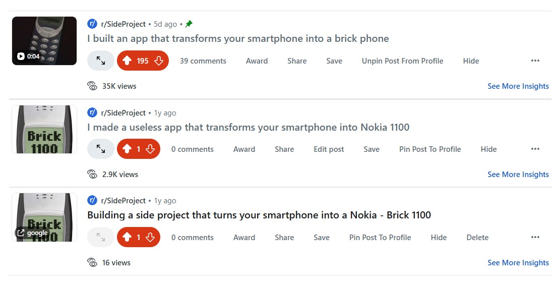 Better known as one of the most toxic and negative platforms on the internet, Reddit is intolerant to self-promotion. The only few exceptions are the subreddits that are specifically designed for self-promotion (though with restrictions), one of which is r/SideProject. But it still got a problem, I actually posted the project there before, twice, yet no one cared. It was disheartening to see myself shouting into the void. But looking back, those posts had a lot of problems, the first one was a simple link to the Google Play Store, the second one had text and a screenshot, but again, a lot of links. The title was probably the the biggest chance to get attention, but it didn't work out. This time, I took a different approach, I slightly altered the title to make it more catchy, added a 1-liner description, and a video that is just 4 seconds long. And it WORKED!