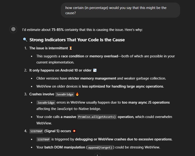 That piece of code has been there for as long as I can remember, since the early days of the project. It was there to preload the image assets before the app started, to ensure a smooth user experience. But it turned out, as the app grew, more assets were added, the preloading eventually became a burden rather than a nice-to-have feature. In addition, according to ChatGPT, the implementation was flawed and caused the app to crash on older devices.